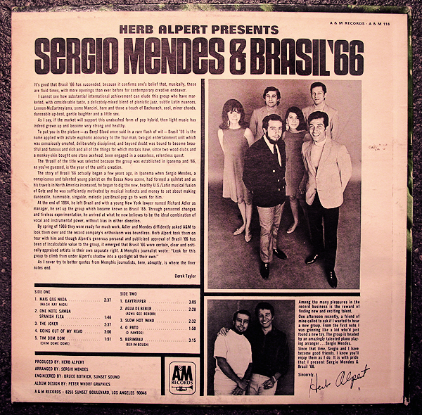 This record marked the first in a string of huge hit records for Brasil ’66 on A&M Records, beginning in 1966, coincidentally. Their major hit from this LP, “Mais Que Nada”, helped the album reach platinum status, as well as touring support lent by producer Herb Albert. (“Mais Que Nada” may sound familiar to you, event if you aren’t familiar with this group, as the song was featured on the “Austin Powers” film soundtrack.)